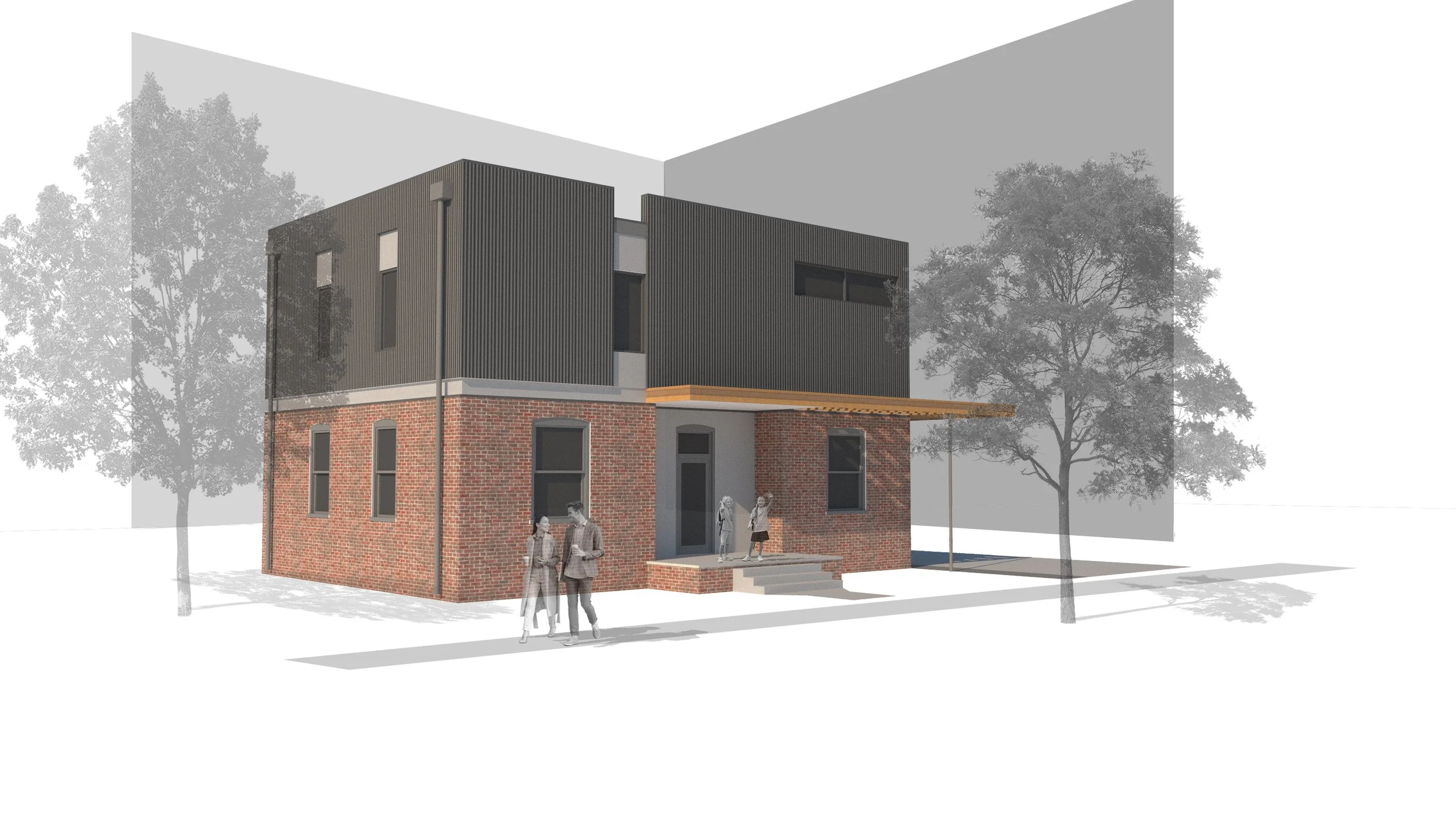 The client purchased a small 1,400 SF one-story brick cottage on a corner lot of a historic downtown neighborhood in Charlottesville, VA. Needing extra living space to make the new home realistic for their 4-person family, and not wanting to consume their small yard with an addition, they opted for the scheme that expanded upwards. We removed a failing roof that need to be replaced, underpinned the foundation at key locations, kept the modest brick box as the new base for a modern “hat” on top. The addition provides 3 new bedrooms and a home studio / office that can flex to a fourth bedroom in the future. In making the connection between the new and the old, we rearranged the spaces at the rear of the house to provide a large new family room adjacent to the kitchen and a large screen porch / 3 season room to improve the house’s connectivity to its back yard.